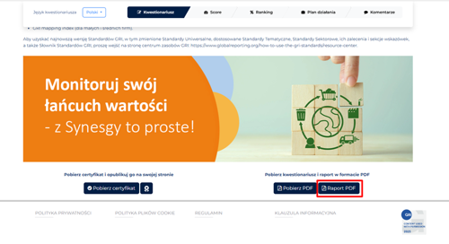 Raport jest przygotowany w języku kwestionariusza i można go pobrać bezpośrednio z konta firmy na platformie Synesgy.