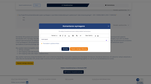 Wprowadziliśmy ulepszenia w funkcjonalności współpracy przy wypełnianiu kwestionariusza, które ułatwią zarządzanie kwestionariuszem i komunikację w zespole: