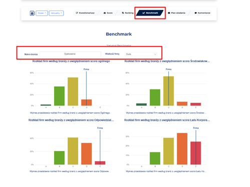 Funkcja Benchmark jest teraz dostępna dla wszystkich nowych certyfikatów. Po przejściu procesu certyfikacji kwestionariusza ESG, na profilu Twojej firmy pojawi się nowa zakładka o nazwie „Benchmark”. W łatwy sposób porównasz jak wypada Twoja firma na tle branży ale także w porównaniu do firm różnej wielkości. Możesz analizować swój wyniki ogólny (ogólny score ESG), ale także sprawdzić, w którym obszarze ESG jest mocniejszy lub słabszy od konkurencji.