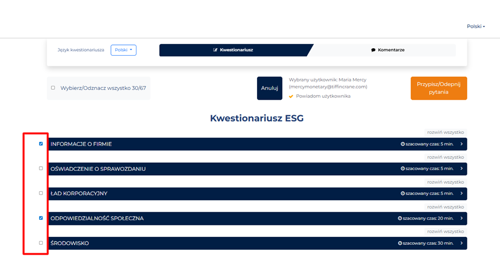 Teraz możesz przypisać cały moduł kwestionariusza, zaznaczając checkbox obok wybranej sekcji – szybciej i wygodniej!